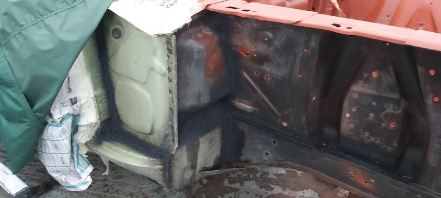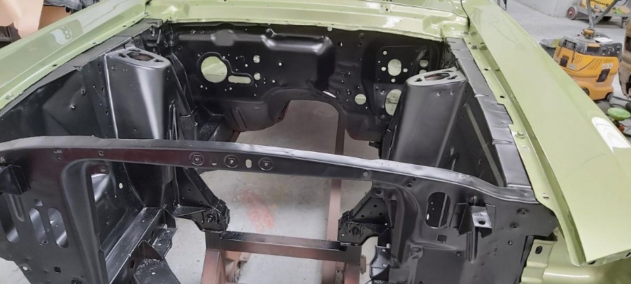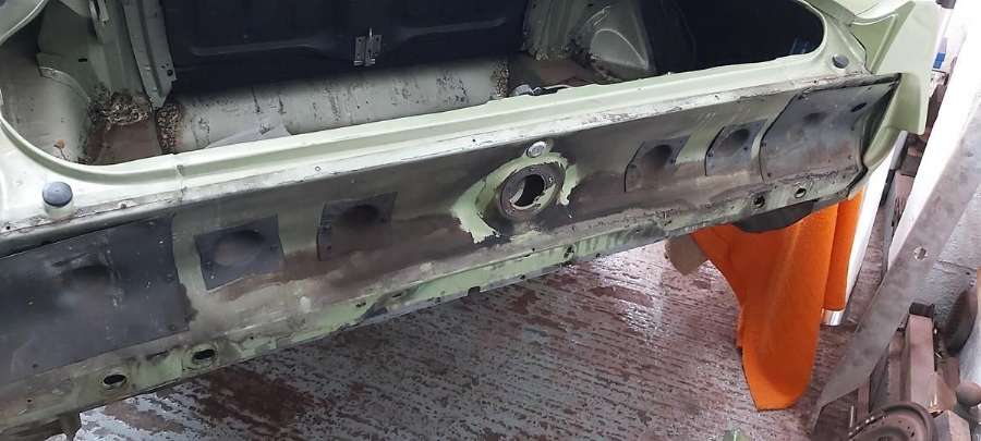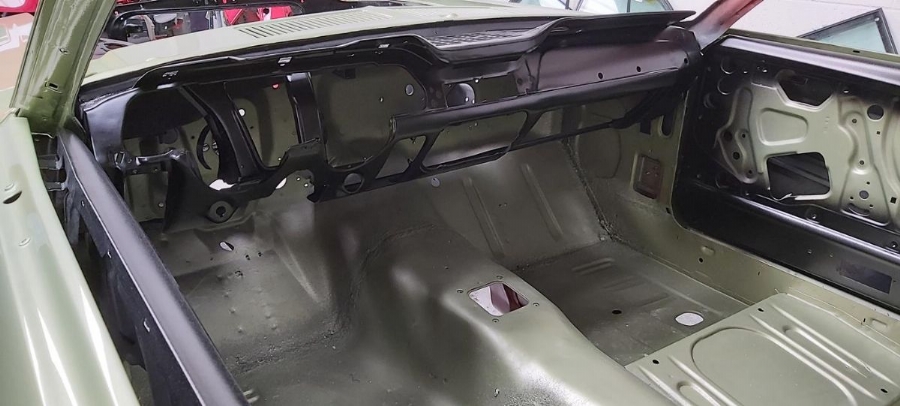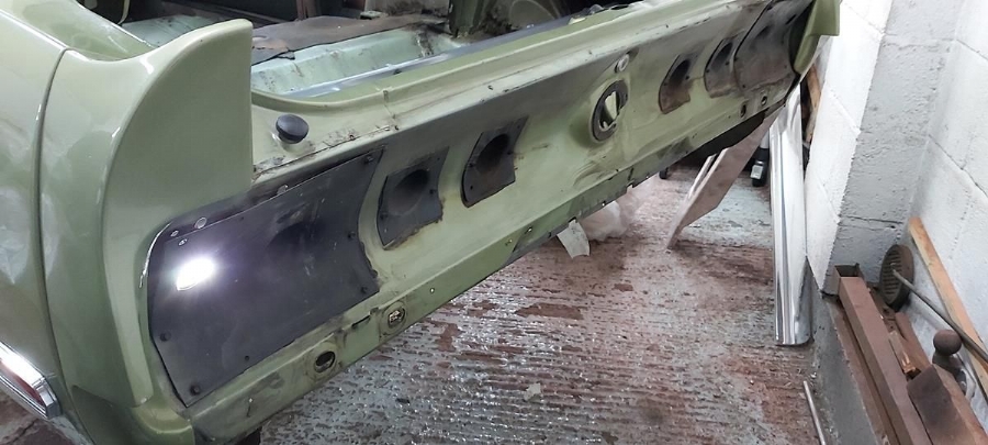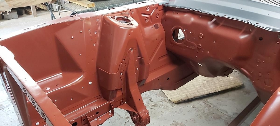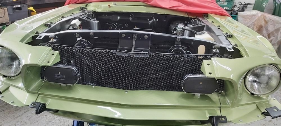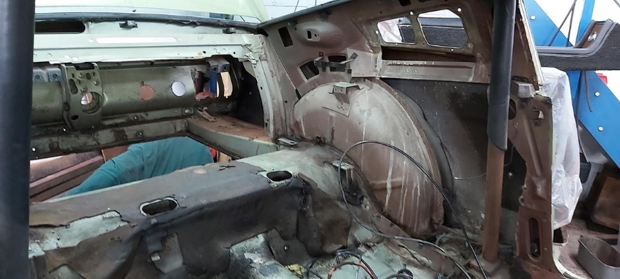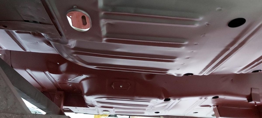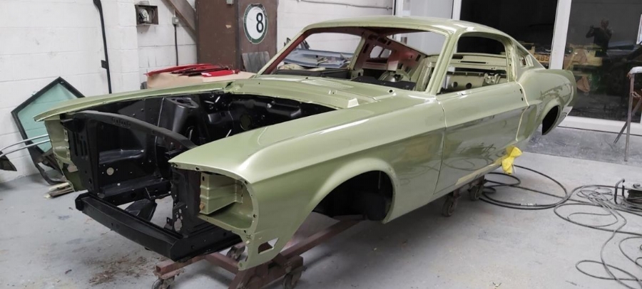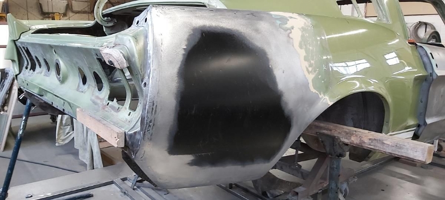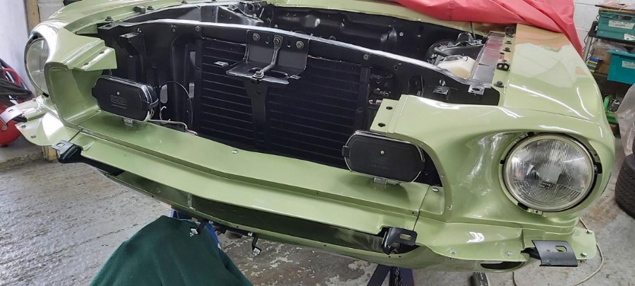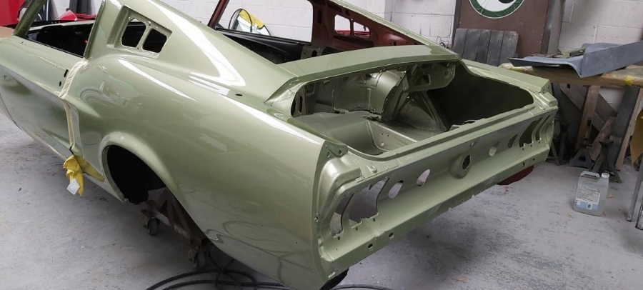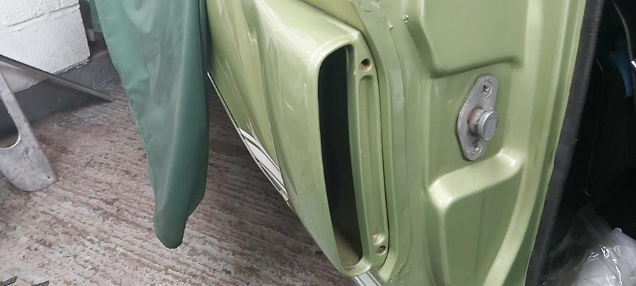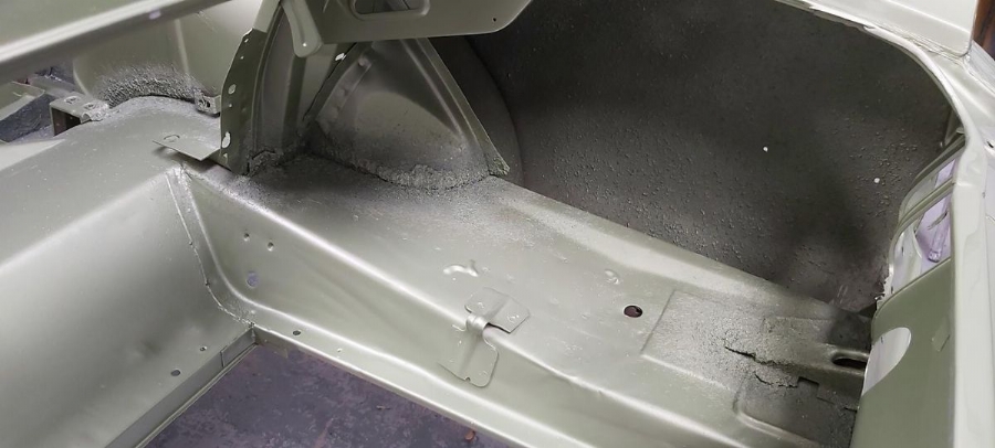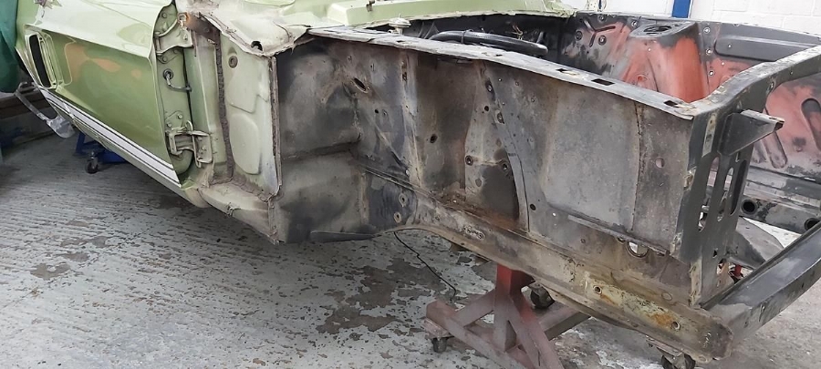 Undergoing an very detailed underbody refinish back to Factory specs. with any missing detail items found and refitted. Upon inspection of the cars external structure with some of the rear internal trim removed, evidence came to light of a very old accident and repair, probably completed when the car was quite new. A decision was made to re-repair local areas to a higher standard and make good other small sections of body originally marked by this old accident. This repair work has been completed and the cars shell now fully detailed and repainted in its correct Lime Gold.