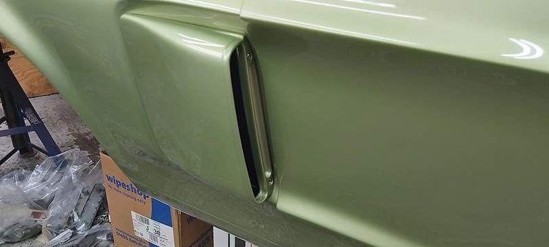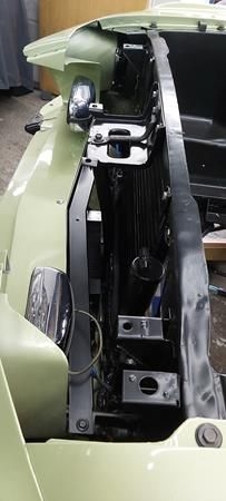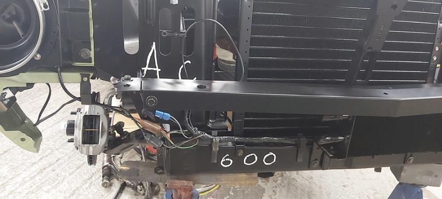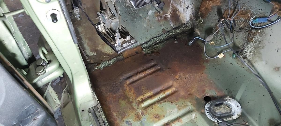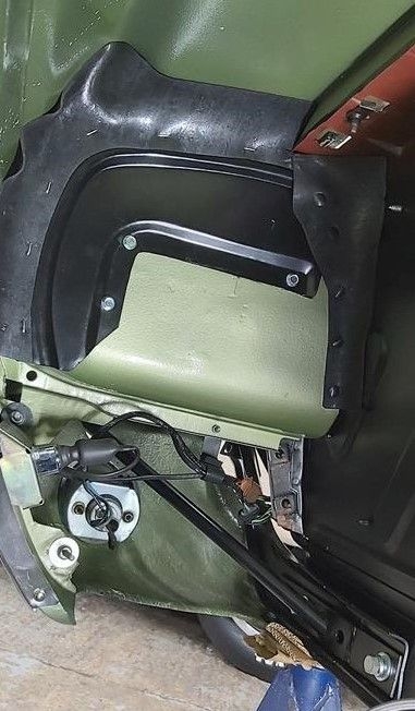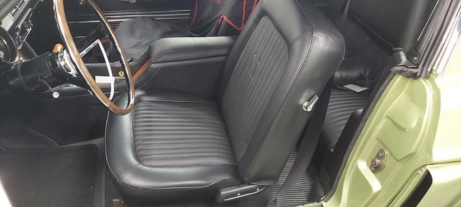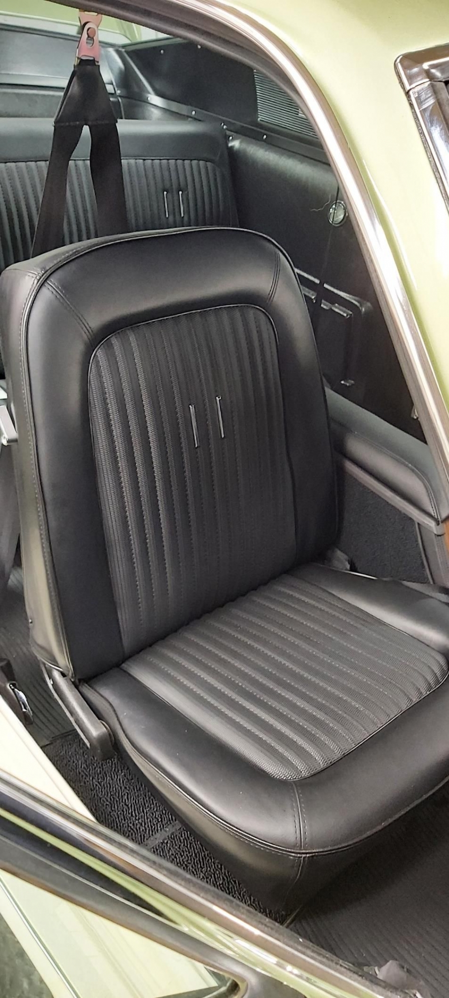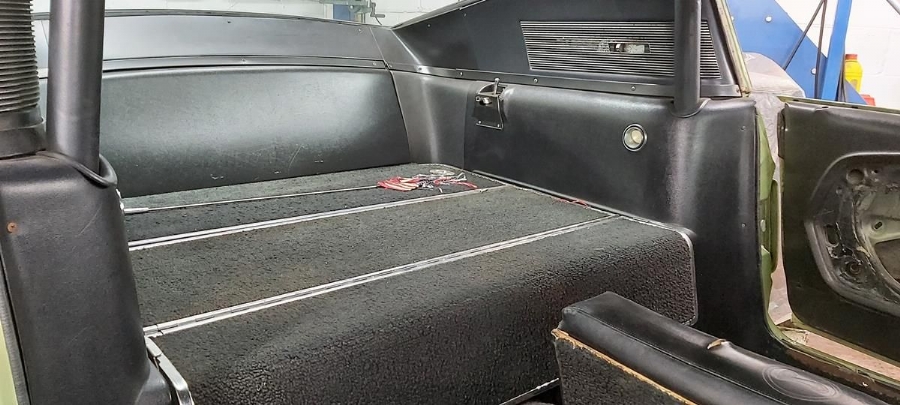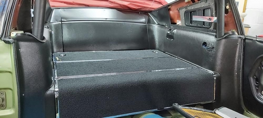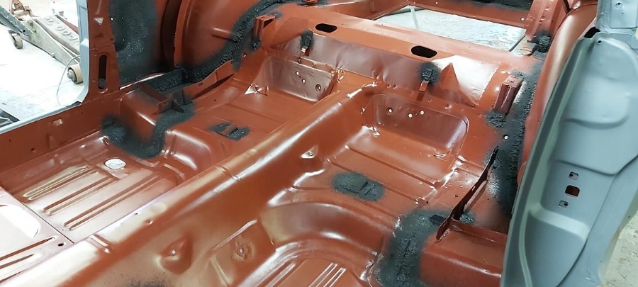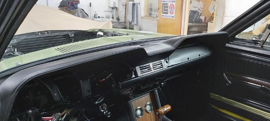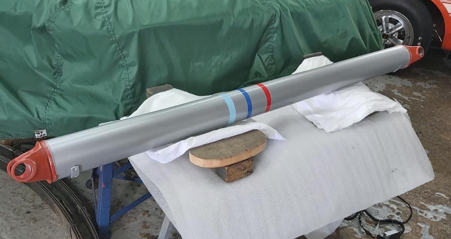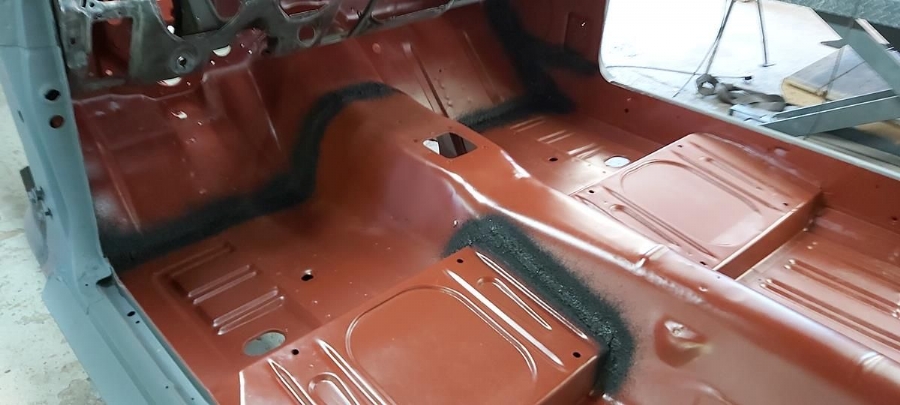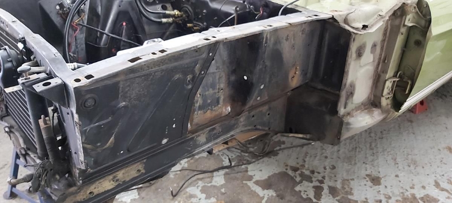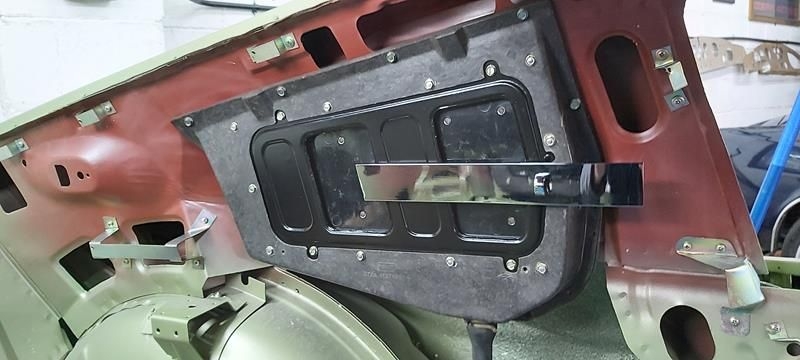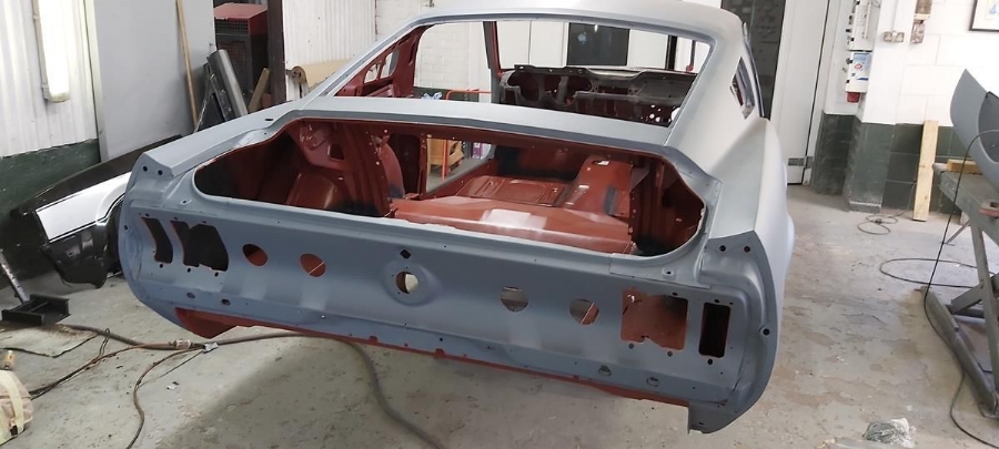 Undergoing an very detailed underbody refinish back to Factory specs. with any missing detail items found and refitted. Upon inspection of the cars external structure with some of the rear internal trim removed, evidence came to light of a very old accident and repair, probably completed when the car was quite new. A decision was made to re-repair local areas to a higher standard and make good other small sections of body originally marked by this old accident. This repair work has been completed and the cars shell now fully detailed and repainted in its correct Lime Gold.