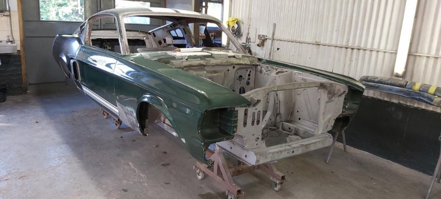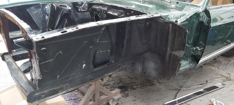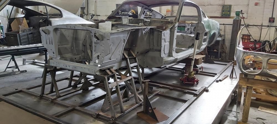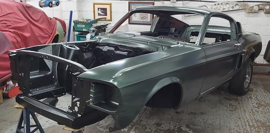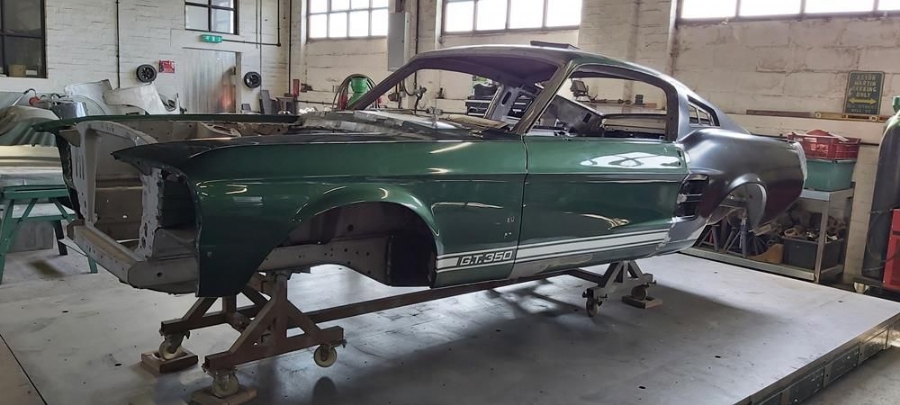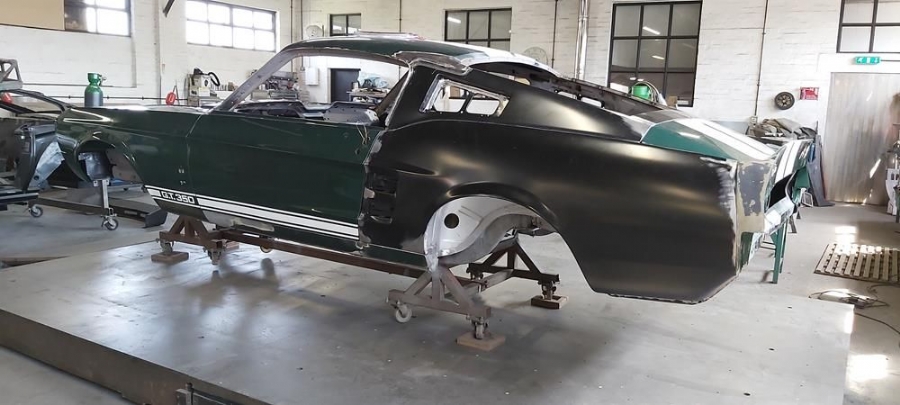 The car has now been fully disassembled, the bare shell blast cleaned and a very detailed and correct structural shell repair undertaken at ASR Ltd. The shell was fitted onto the companies engineering bed-plate and installed on my 67/68 Mustang detail chassis positioning jigs, where it can be very accurately fixed.