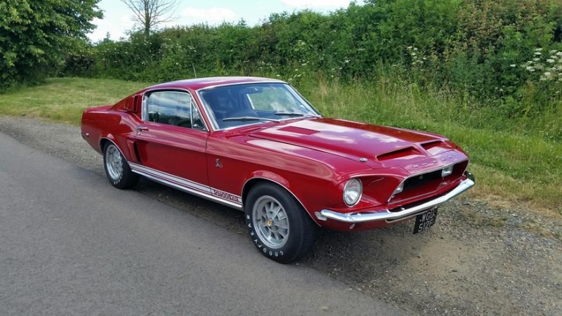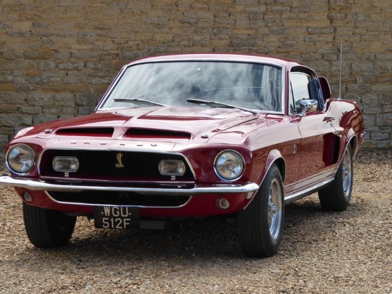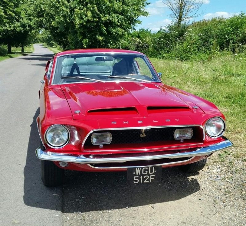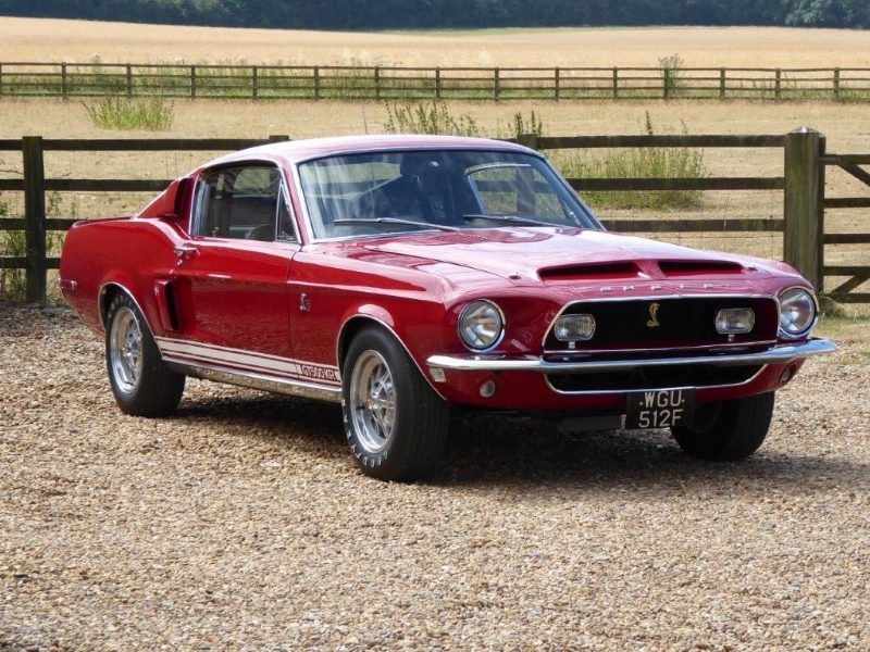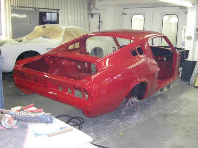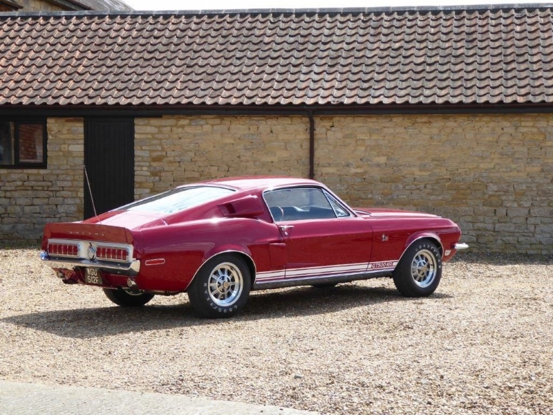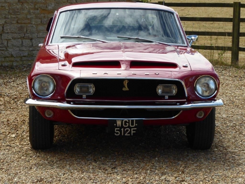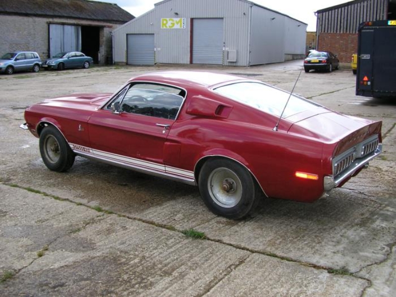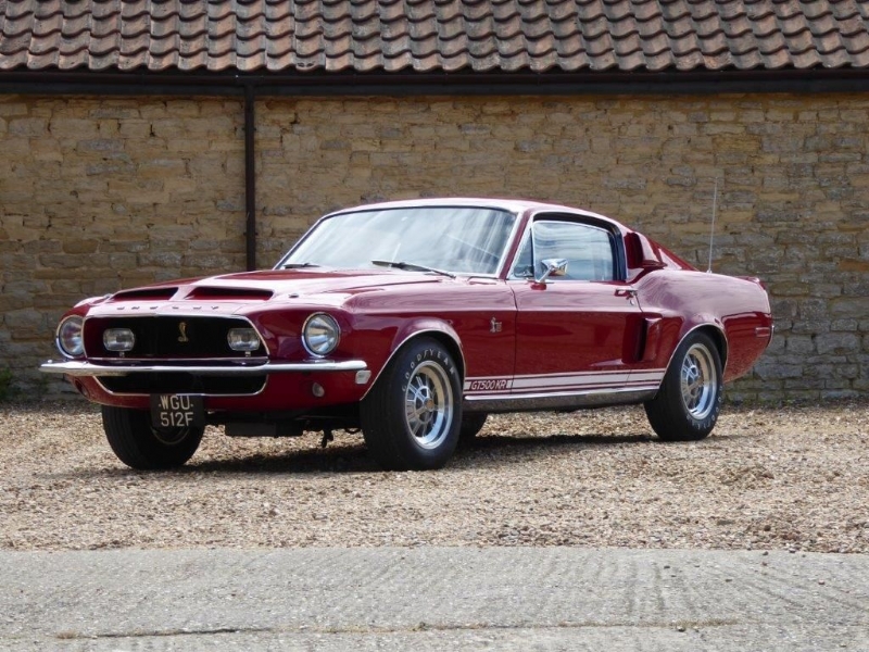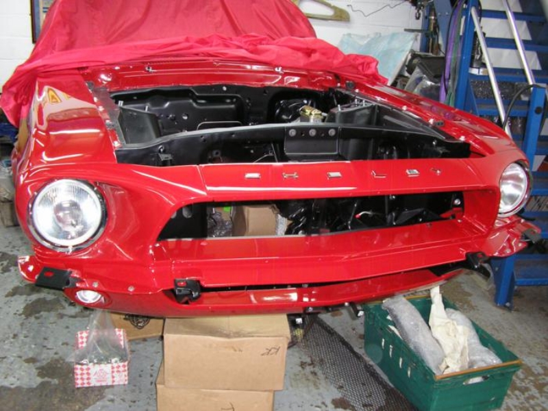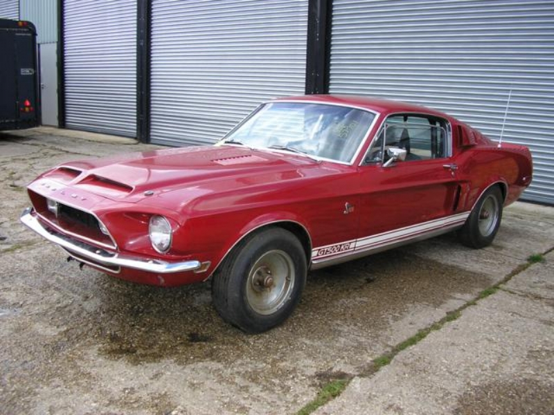 1968 Shelby GT500KR. a 3 owner, numbers matching 428CJ, 4-speed car in Red with Black interior. 39000 miles from new and just unearthed from the last owners garage. Not driven since 1993. This vehicles body and chassis restoration has proven to be one of the most complex i have been involved with. The specialist chassis jig and engineering work has been superbly undertaken by my ex-Aston Martin colleagues at ASR Motorbody Engineering. Body reconstruction now completed using Dragon Wheels own very accurate chassis jigs which with ASR's skilled work have yeilded a superb, highly authentic and carefully repaired shell. The bodyshell has been fully redetailed and repainted in the Factory original Candy Apple Red by Mike Hughes at Lone Pine. Reassembly of the shell now fully underway