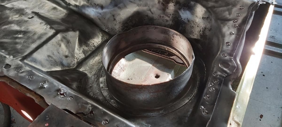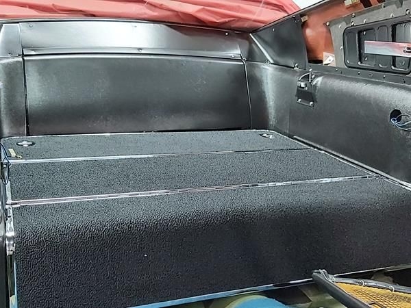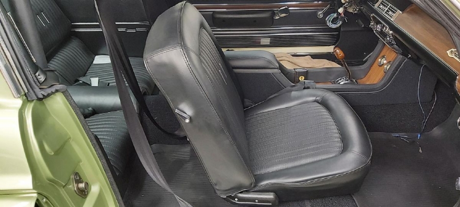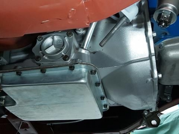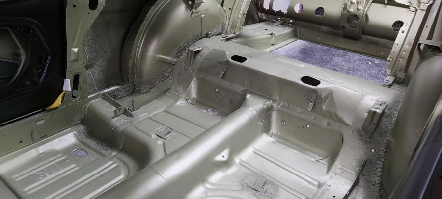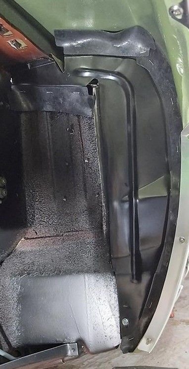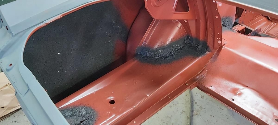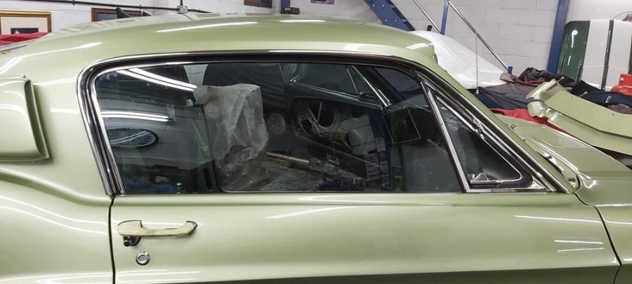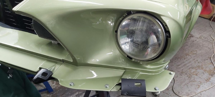 Undergoing an very detailed underbody refinish back to Factory specs. with any missing detail items found and refitted. Upon inspection of the cars external structure with some of the rear internal trim removed, evidence came to light of a very old accident and repair, probably completed when the car was quite new. A decision was made to re-repair local areas to a higher standard and make good other small sections of body originally marked by this old accident. This repair work has been completed and the cars shell now fully detailed and repainted in its correct Lime Gold.